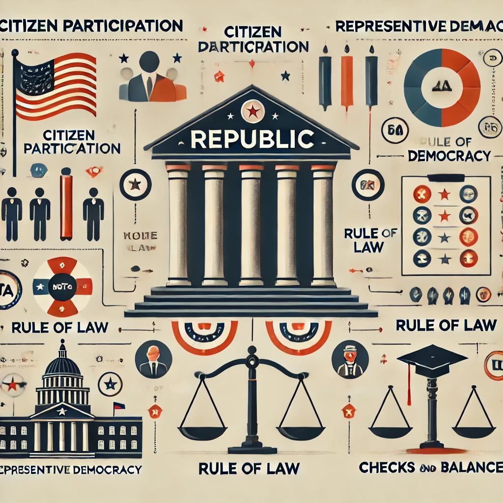 - 시민 주권: 공화정에서 주권은 국민에게 있으며, 국민은 선거를 통해 정부를 구성합니다. 이는 국민이 국가 운영의 중심이라는 점을 강조합니다.